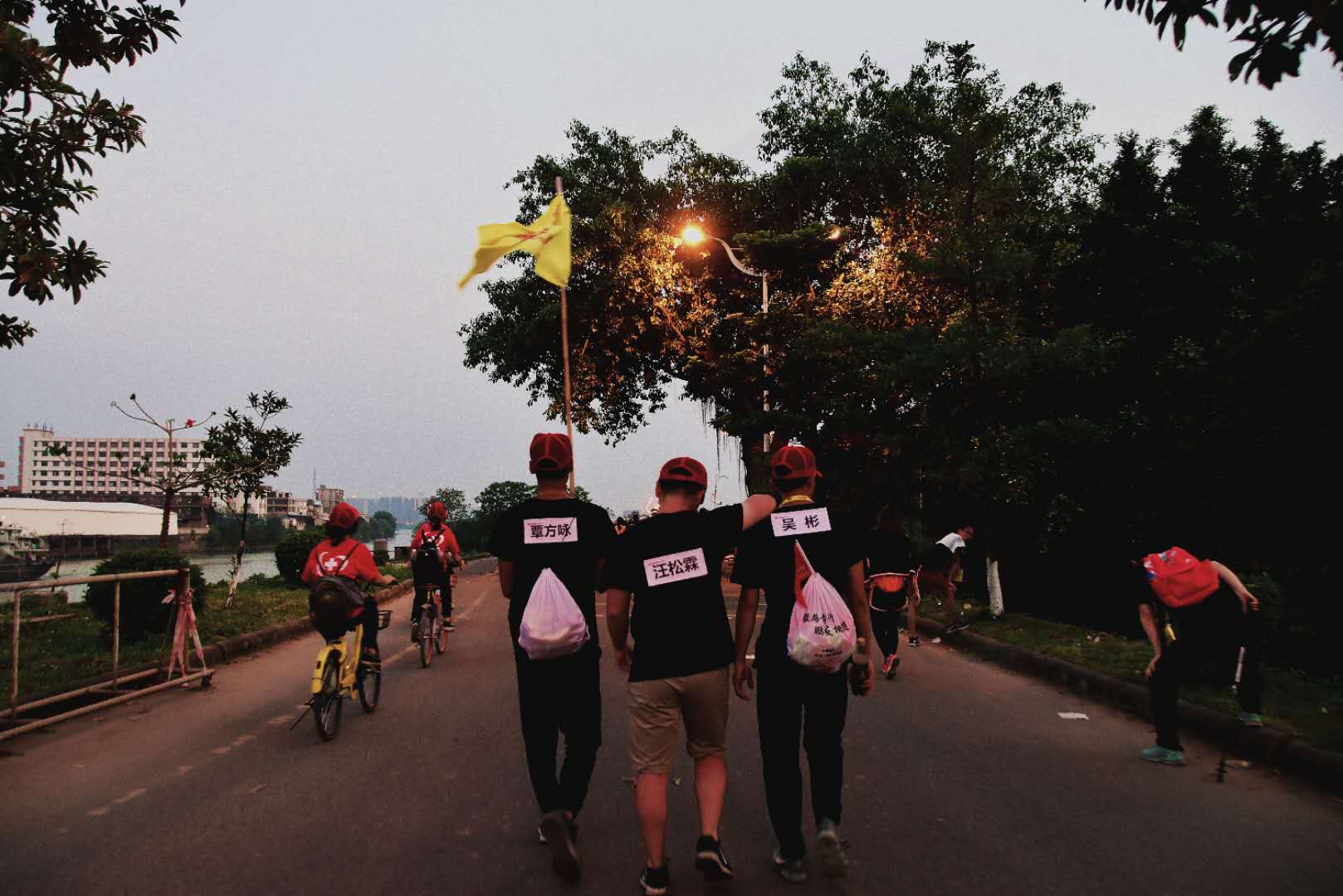 The implication is that when a small partner can't keep going the whole course due to physical reasons, the brand name can be torn off and put on the teammates, and the teammates will take this pinning in another way to help them reach the end.